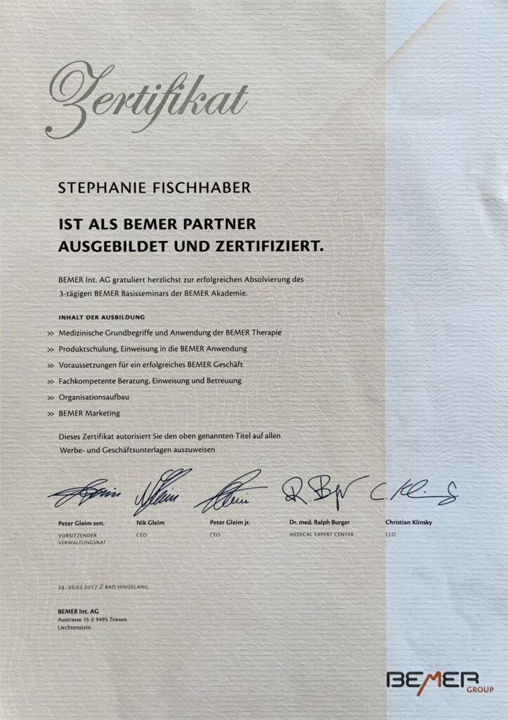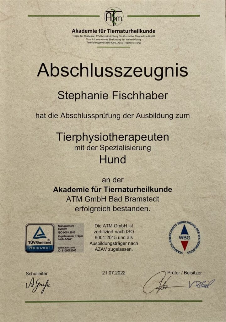 Über einen unserer Hunde bin ich zum Mono-Zughundesport „Bikejöring“ gekommen und mit Herzblut seit 2015 in dieser Kategorie aktiv. Aus dieser sportlichen Leidenschaft und der Verbundenheit zu den Vierbeinern ist der Weg zur Tierphysiotherapie für mich gezeichnet gewesen. Nach 2,5 jähriger Ausbildung legte ich die Prüfung zur Tierphysiotherapeutin erfolgreich ab. Die bereits in 2016 erworbene Qualifikation zum BEMER Partner und die damit vielerlei gesammelten Erfahrungen, im Bereich der physikalischen Gefäßtherapie, sind eine ideale Ergänzung. 2023 konnte ich die Weiterbildung mit Prüfung der TCM (traditionelle chinesische Medizin) für Tiere erfolgreich ablegen.